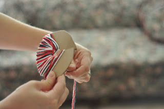 Take your pom off through the slit. Use the long string that is extra to tie your poms onto your garland twine, or whatever you wish to use for your garland.