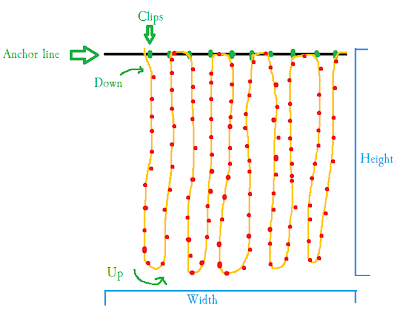 3) Going back to my beautiful paint drawing, start at one end, and let the garland drip down to the desired length. Bring the strand back up and clip again to the next clip on your anchor line. Keep going until all of your garland is gone.