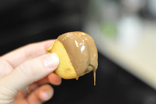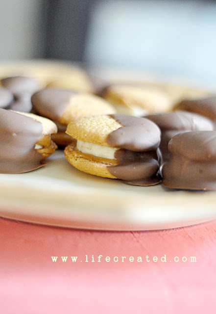 5) Once your chocolate is melted, dip you cookie sandwiches in half-way.