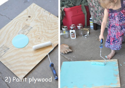 My supplies were: a piece of pine ply wood measuring 20x26 inches, sample jar of teal paint, wood glue, drill with 1 skrew, paint roller, white lace trim flower pot, fake flowers, 1 can of white spray paint, white paint and small paint brush (both which I already had)